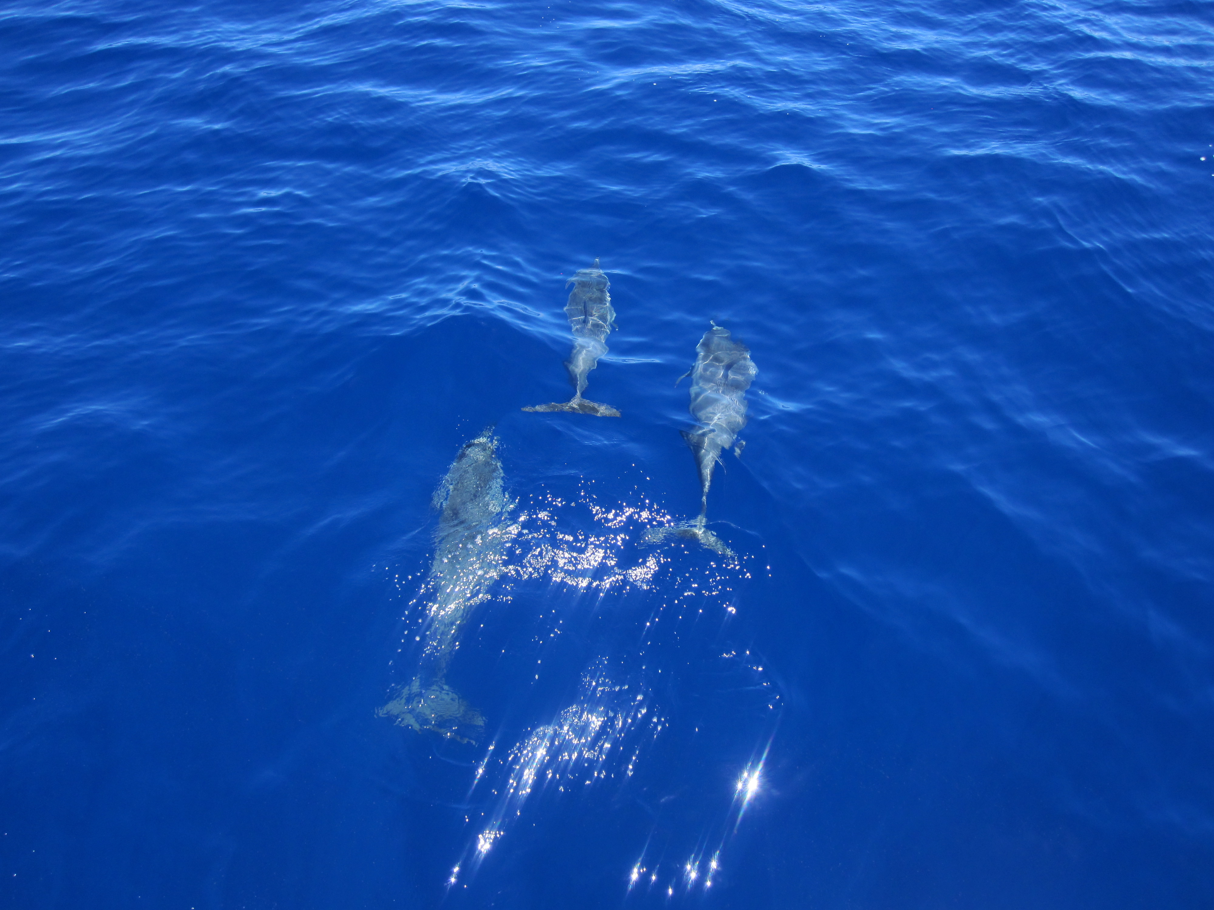 Certaines femelles dauphins s’avançaient avec leur rejeton de l’année à l’avant pour se laisser pousser par la vague du bateau. Ils nous suivaient et appréciaient notre présence, c’est certain. Les plus curieux sautaient et faisaient des vrilles à côté du bateau tandis que d’autres se tenaient plus à l’écart. À les voir sauter et tourner dans les airs, j’ai vite compris pourquoi on les appelait les spinner dolphins en anglais!