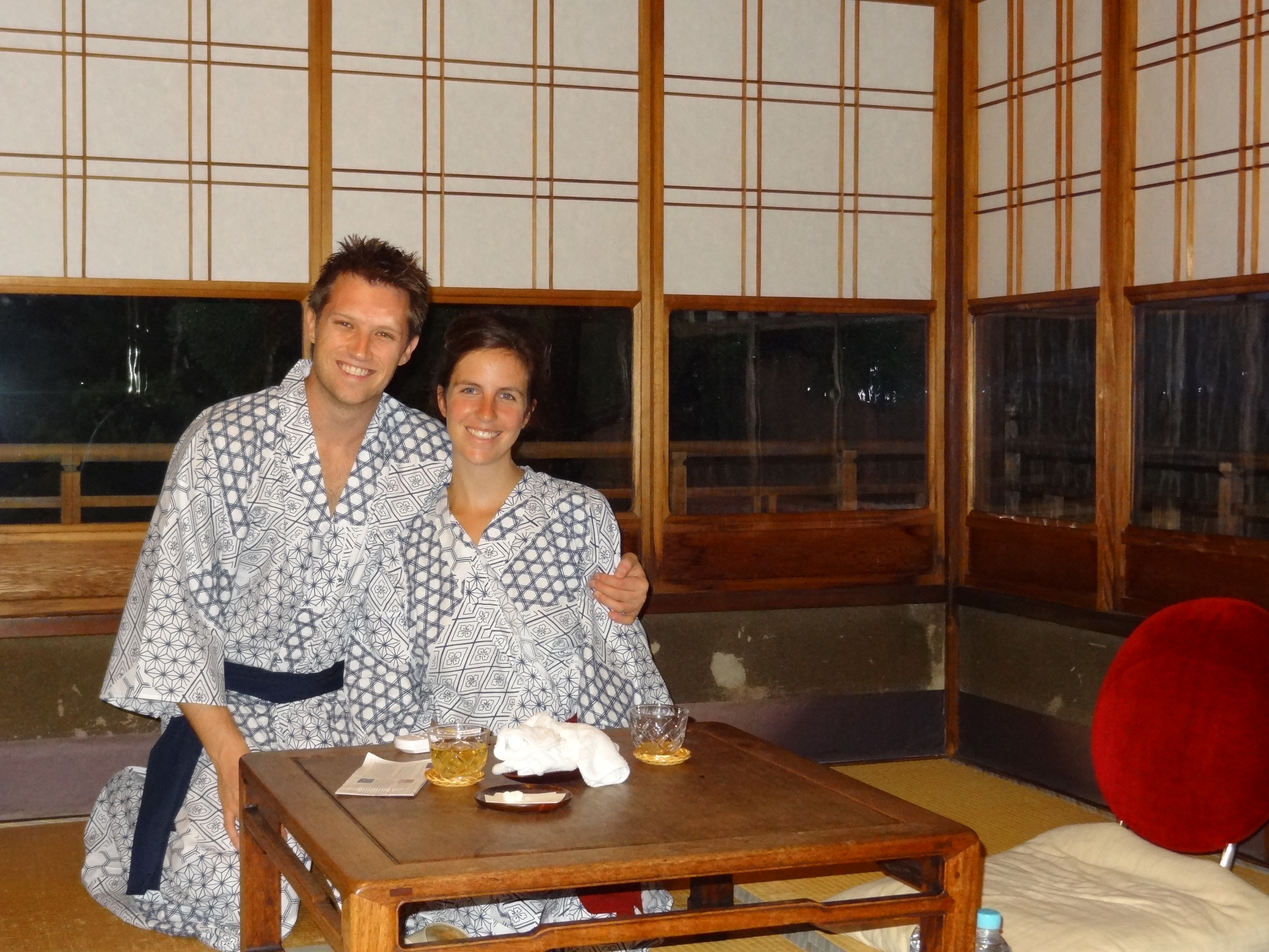 plus confiance en Kyoto pour savourer cette expérience d’immersion dans la culture. À notre arrivée, on nous a clairement fait comprendre qu’il fallait remplacer nos sandales sales par des petits chaussons pour pouvoir mettre un pied à l’intérieur. On ne s’est pas fait prier, on les a mis. Puis, une dame qui semblait gentille mais qui ne parlait pas un traître mot en anglais nous a fait signe de la suivre. Elle nous a mené jusqu’à notre chambre, du moins c’est ce que nous avons compris. Il n’y avait aucun lit dans la pièce, seulement une table basse avec du thé et des coussins pour s’asseoir. Il y avait également des kimonos pliés dans un coin. Il n’y avait aucun autre meuble. C’était une pièce de bonnes dimensions, avec de belles fenêtres antiques qui occupaient deux murs complets de la chambre.